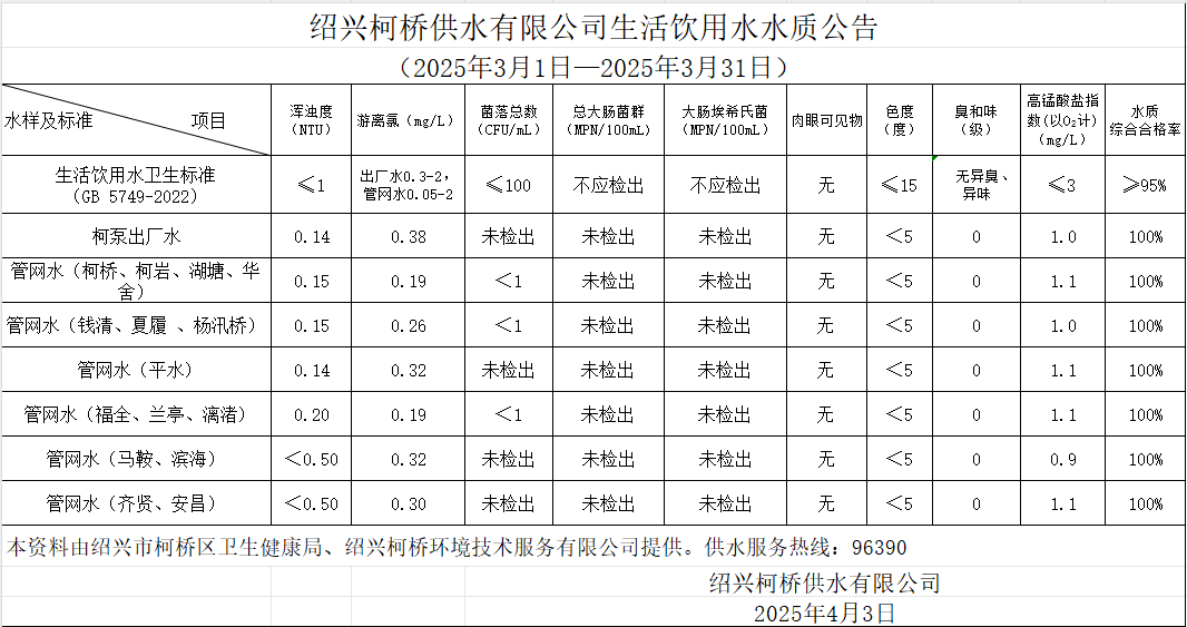 生活飲用水水質公告(2025年3月1日—2025年3月31日)